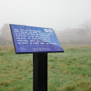In her work, artist Merel Smitt often uses prompts: short invitations or instructions that encourage you to experience a place, situation or system in a new way. The prompts in the landscape function as instructions that invite you to look, listen and move differently. Sometimes poetic, sometimes activist, sometimes social or spatial.